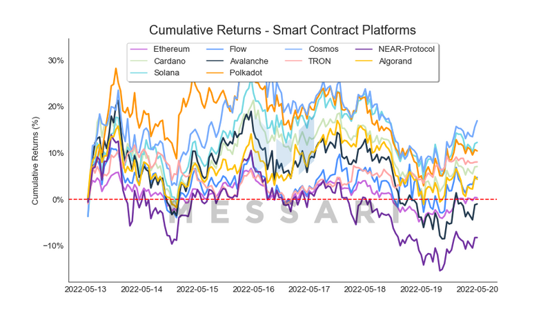 Messari.io’s Weekly Recap for May 20, 2022 reported that all seven of the sectors it reports on finished the week in positive territory overall, with Smart Contract Platforms return 4.9% for the week: